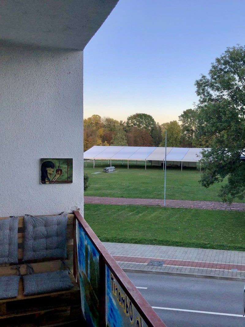 The two-seater is made out of pallets and is very comfortable, the view of the park and the gym is great. There’s always some movement, and yet it’s not noisy. Artificial grass is on the floor, so it's great to be without slippers because it massages your feet in a way :)
